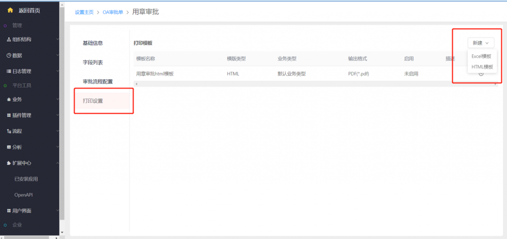 系統設置—擴展中心—已安裝應用—OA審批單—打印設置,和對象一樣支持excel和html模板
