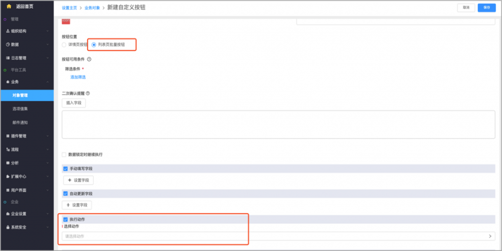 - 批量執行后返回結果:批量按鈕(如批量分配/批量刪除/自定義按鈕)的篩選條件不影響按鈕是否顯示,而是批量執行后返回結果