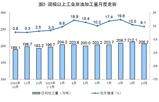 原油加工保持穩定增長。10月份,加工原油6393萬噸,同比增長9.1%,增速比9月份放緩2.9個百分點,日均加工原油206.2萬噸。1—10月份,加工原油61876萬噸,同比增長11.2%。