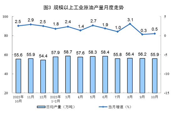 原油生產增速略有加快,進口保持較快增長。10月份,生產原油1733萬噸,同比增長0.5%,增速比9月份加快0.2個百分點,日均產量55.9萬噸。進口原油4897萬噸,同比增長13.5%,增速比9月份放緩0.2個百分點。