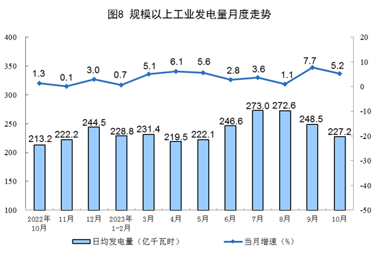 電力生產穩步增長。10月份,發電量7044億千瓦時,同比增長5.2%,增速比9月份放緩2.5個百分點,日均發電227.2億千瓦時。1—10月份,發電量73330億千瓦時,同比增長4.4%。