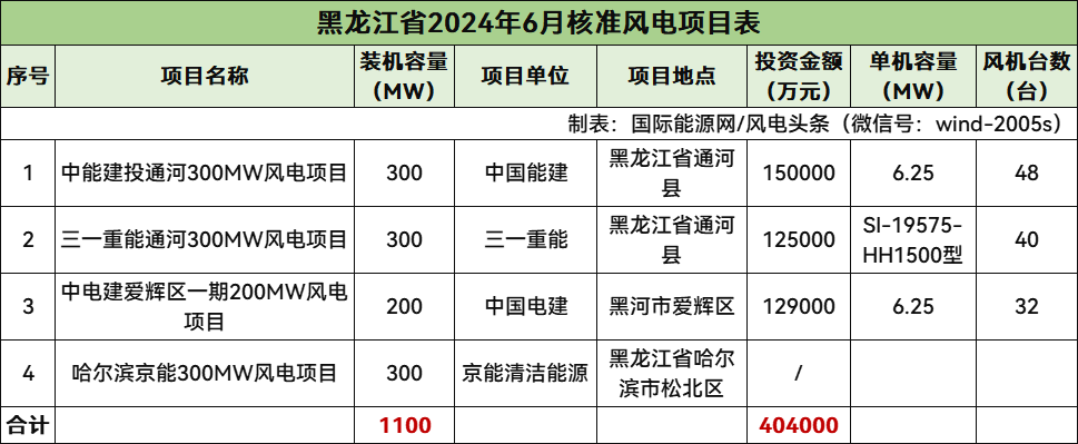 黑龍江核準(zhǔn)4個(gè)風(fēng)電項(xiàng)目,總規(guī)模1100MW,總投資404000萬元,均為陸上風(fēng)電項(xiàng)目。
