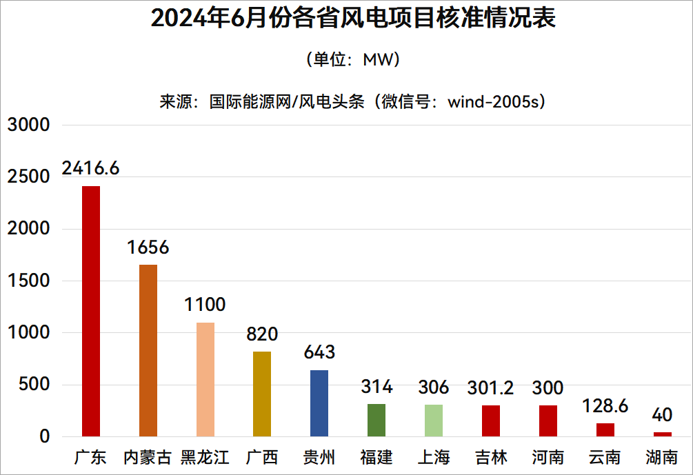 2024年6月風(fēng)電項(xiàng)目獲核準(zhǔn)的省份分別是廣東、內(nèi)蒙古、黑龍江、廣西、貴州、福建、上海、吉林、河南、云南、湖南等11個(gè)省份。