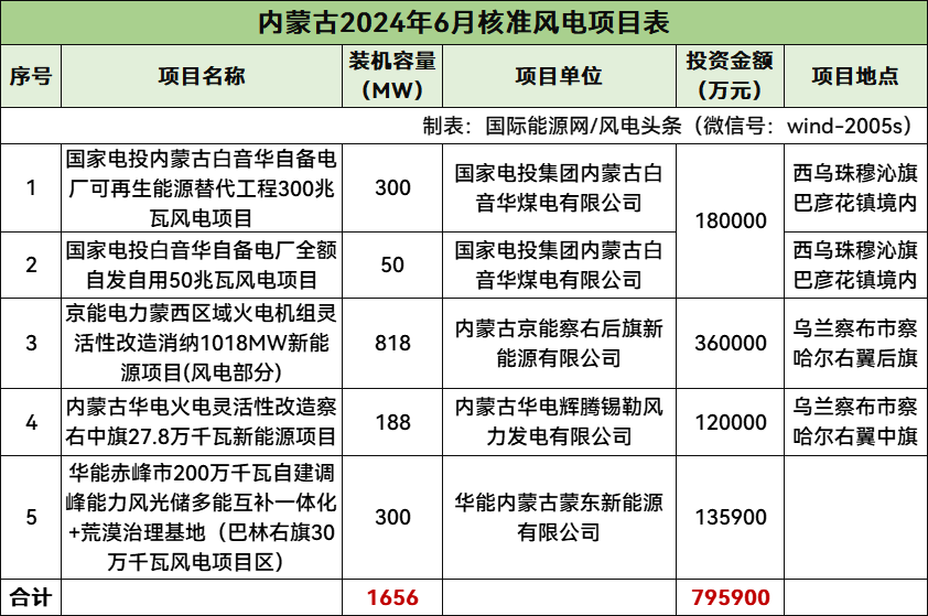 內(nèi)蒙古核準(zhǔn)5個(gè)風(fēng)電項(xiàng)目,總規(guī)模1656MW,總投資795900萬元,均為陸上風(fēng)電項(xiàng)目。