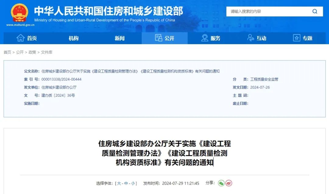 7月29日,住房城鄉建設部辦公廳發布關于實施《建設工程質量檢測管理辦法》《建設工程質量檢測機構資質標準》有關問題的通知。通知提出:為保障建設工程質量檢測新舊資質平穩過渡,新舊資質過渡期延長至2024年10月31日。