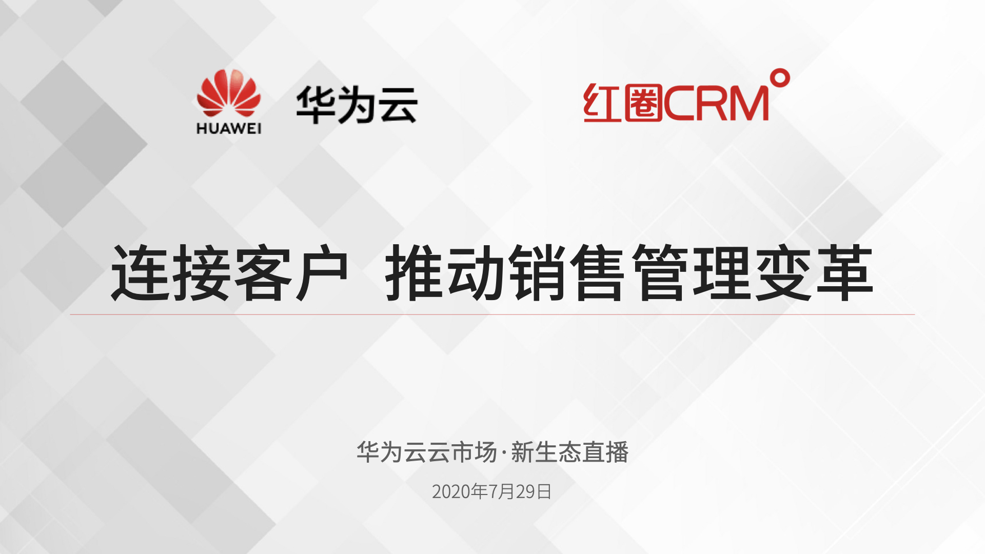7月29日周三 15:00,紅圈聯(lián)合創(chuàng)始人兼 SVP 牛其建將在華為云云市場(chǎng)·新生態(tài)直播間為大家?guī)?lái)一場(chǎng)精彩的主題分享——《連接客戶 推動(dòng)銷售管理變革》,歡迎廣大朋友屆時(shí)前來(lái)觀看直播,一同探討企業(yè)數(shù)字智能轉(zhuǎn)型升級(jí)之道。