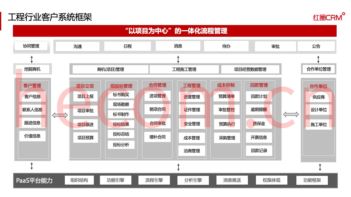 基于紅圈 PaaS 平臺構建的紅圈工程行業 CRM 項目管理系統可以全面提升企業信息化水平,實現全員實時在線移動辦公,對項目執行過程進行精細化管理,規避項目資金風險,管控項目預算及成本的發生,進而徹底推動企業從被動管理到主動干預的轉變,以可視化的數據決策全面提升企業核心競爭力。